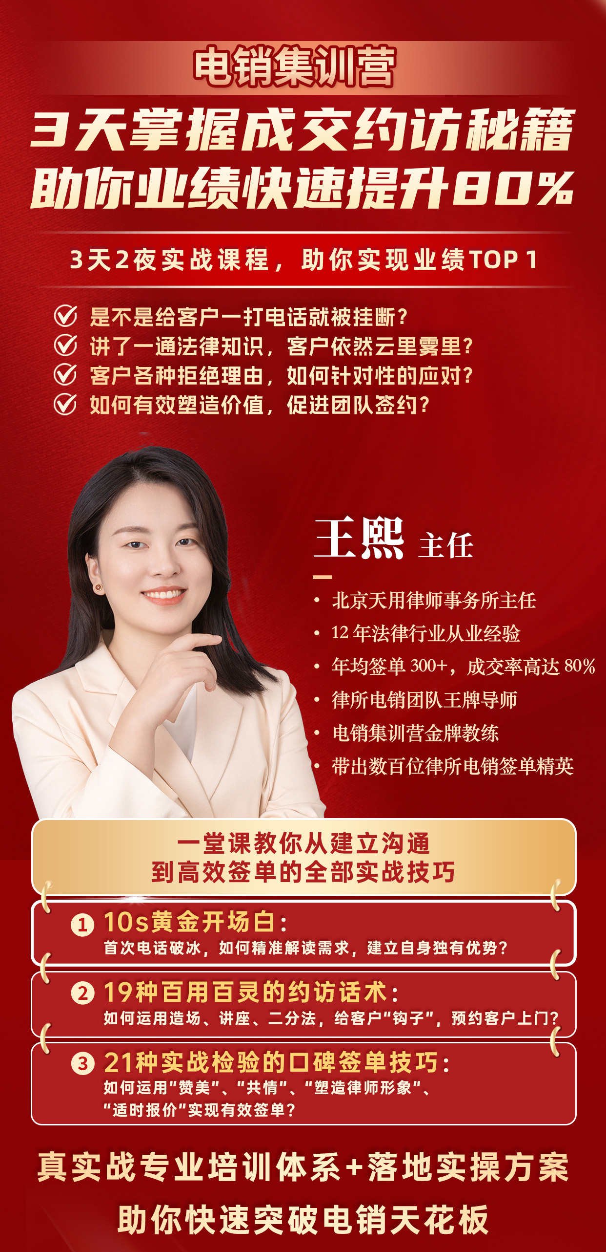 一名優(yōu)秀的電銷人員,無論市場好壞,都可以保持穩(wěn)定的簽單和收入的增長。如何成為優(yōu)秀的電銷精英,北京天用律師事務所主任,律所電銷團隊王牌導師、電銷集訓營金牌教練王熙導師,現(xiàn)場帶學員們邊學邊練,讓實戰(zhàn)總結(jié)的約訪技巧成為學員的肌肉記憶。